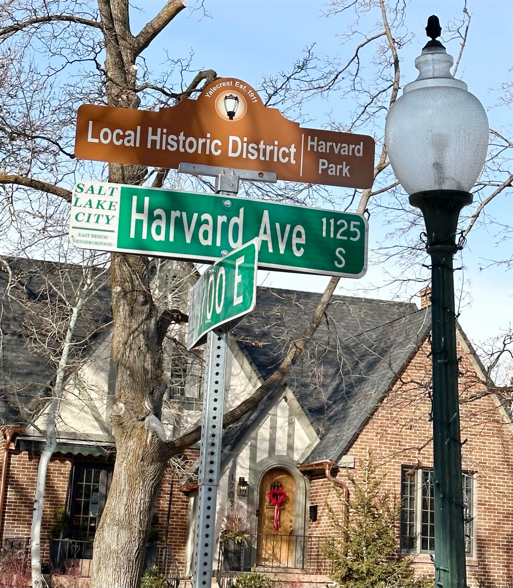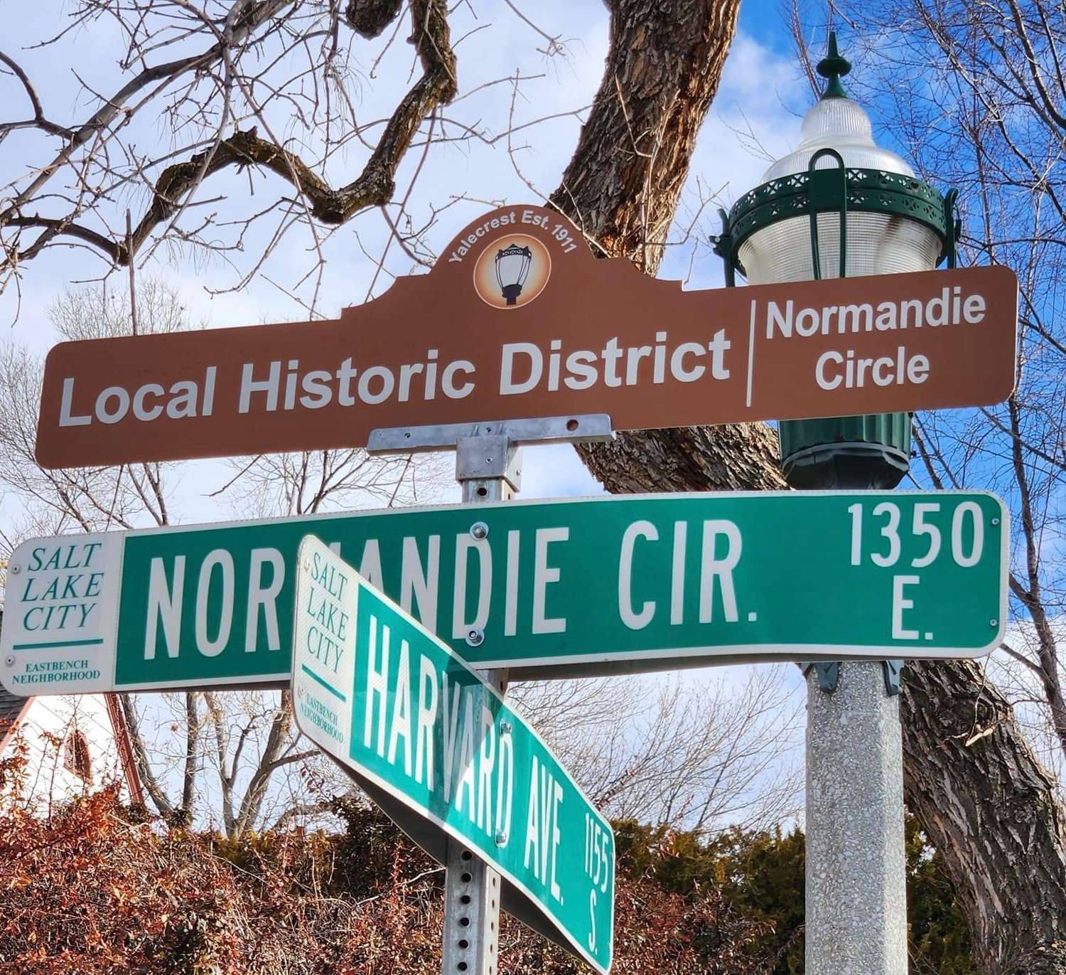 The second type of sign acknowledges local historic district designations within the Yalecrest National District. These smaller signs, installed February 2023, were mounted atop existing street name signs and are similar in placement, shape, style, and design to others throughout the country. Each local historic district, adopted at different times, has its own specific name based on the original Yalecrest subdivision names; there are 22 subdivisions within Yalecrest.