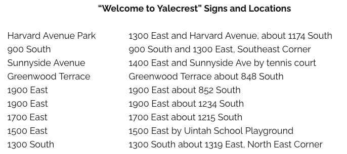K.E.E.P. Yalecrest was awarded funding through the City’s Capital Improvement Program (CIP) for this signage via the Salt Lake City Council. Charlie Luke (District 6 Councilperson at the time) highlighted this project in his December 2019 mailer.